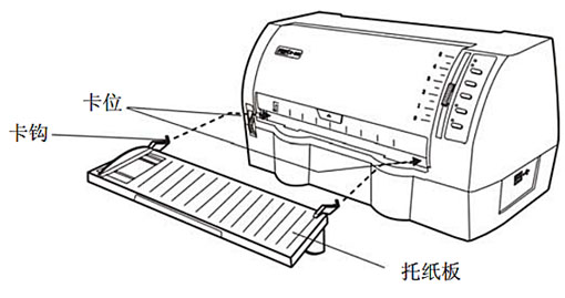 2、如打印機有托紙板,則打開打印機機蓋,將托紙板上的卡位對準打印機上對應的開槽插下,并按壓到位。