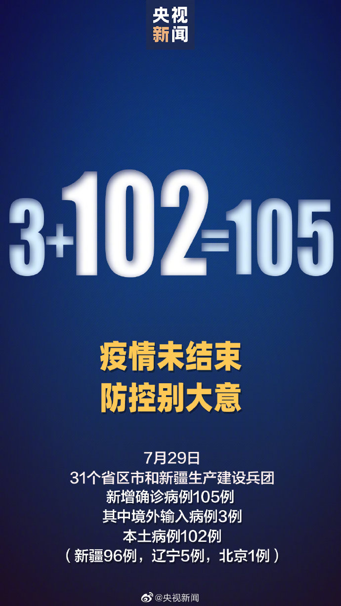據衛健委消息, 7月29日0—24時,31個省(自治區、直轄市)和新疆生產建設兵團報告新增確診病例105例,其中境外輸入病例3例(廣東1例,云南1例,陜西1例),本土病例102例(新疆96例,遼寧5例,北京1例)。