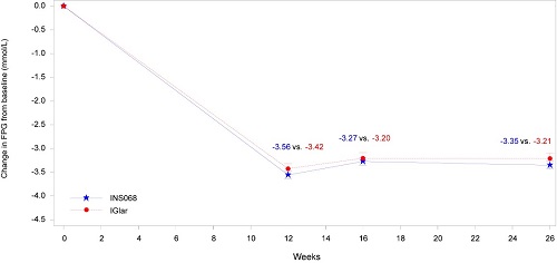 本研究達到預(yù)設(shè)的主要終點,治療26周后,INS068組的HbA1c相對基線變化非劣于IGlar組。INS068 組與 IGlar組的HbA1c降幅分別為 1.34% 和 1.36%, 兩組差值為 0.02%(95% CI:-0.14%,0.18%)。
