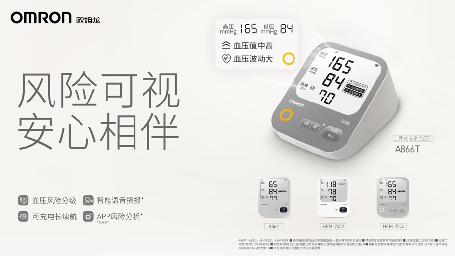 2025年9月6日,上海——歐姆龍醫療健康(以下簡稱 “歐姆龍”)正式發布全新智能風險提醒血壓計新品,涵蓋A866T、HEM-7524、A862及HEM-7522共四款產品。此次推出的新品,精準聚焦高血壓患者痛點,進一步強化血壓風險識別、測量引導與數據服務能力,以 “風險可視,安心相伴” 為核心主張,賦能用戶更便捷準確的自我血壓管理體驗。